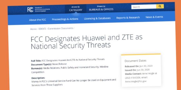 La Comisión Federal de Comunicaciones de EE.UU. (FCC) designó el 30 de junio formalmente a Huawei Technologies Company (Huawei) y a ZTE Corporation (ZTE) como amenazas a la seguridad nacional para la integridad de las redes de comunicaciones de EE.UU. o la cadena de suministro de comunicaciones.
